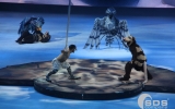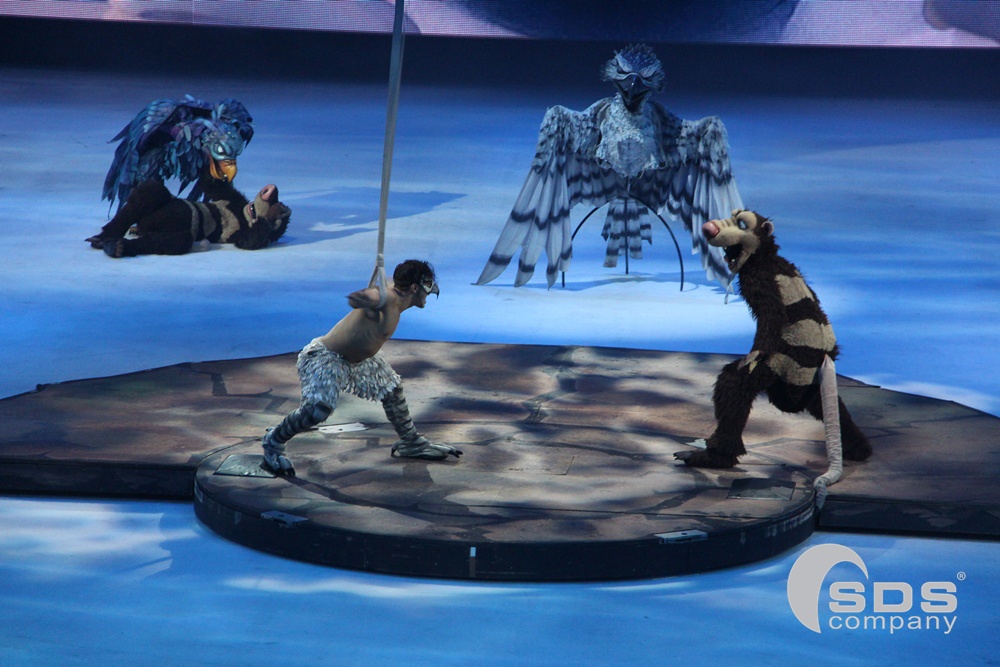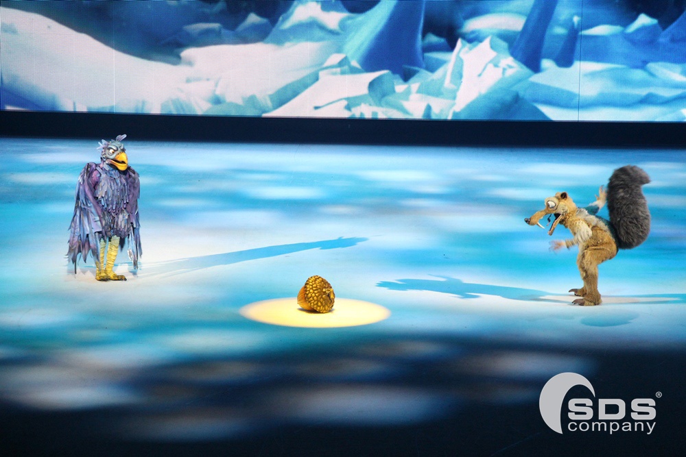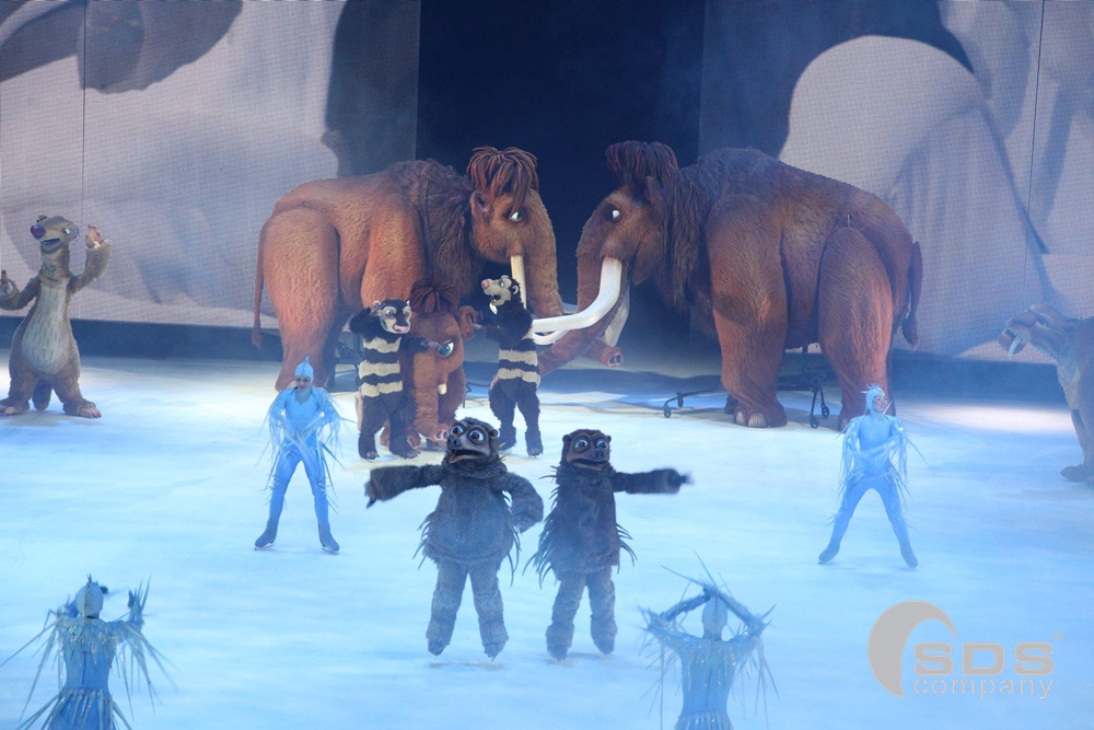 В декорациях, воссоздающих виды из мультика, артисты показывали ледовые танцевальные и акробатические номера. А роли главных героев исполнили огромные модели и ростовые куклы. Они впечатлили публику. Еще бы, ведь размах крыльев нового персонажа, злой птицы Тень, достигал 4 метров, а рост мамонта Мэнни — 3,6 метра в высоту!